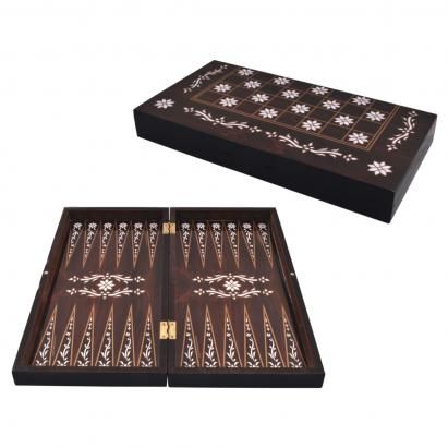 שש בש מעץ מלא עם עיטורים, 30 אבני משחק (פולים) 15 מכל צבע וקוביות.מצידו השני של לוח השש בש יש לוח למשחק דמקה